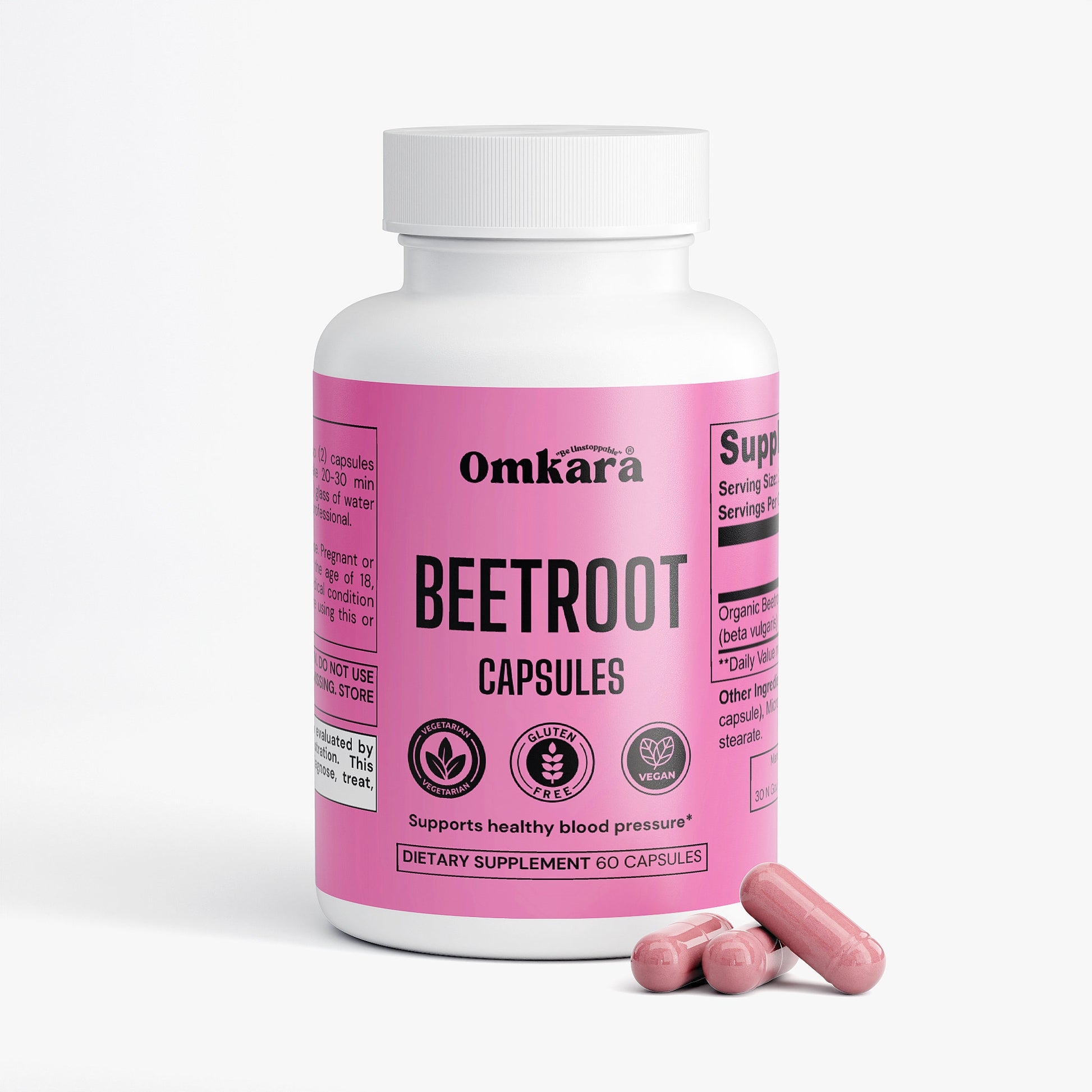 Ingredients: Organic Beetroot Powder (beta vulgaris), Hypromellose (vegetable capsule), Microcrystalline Cellulose, Magnesium Stearate.