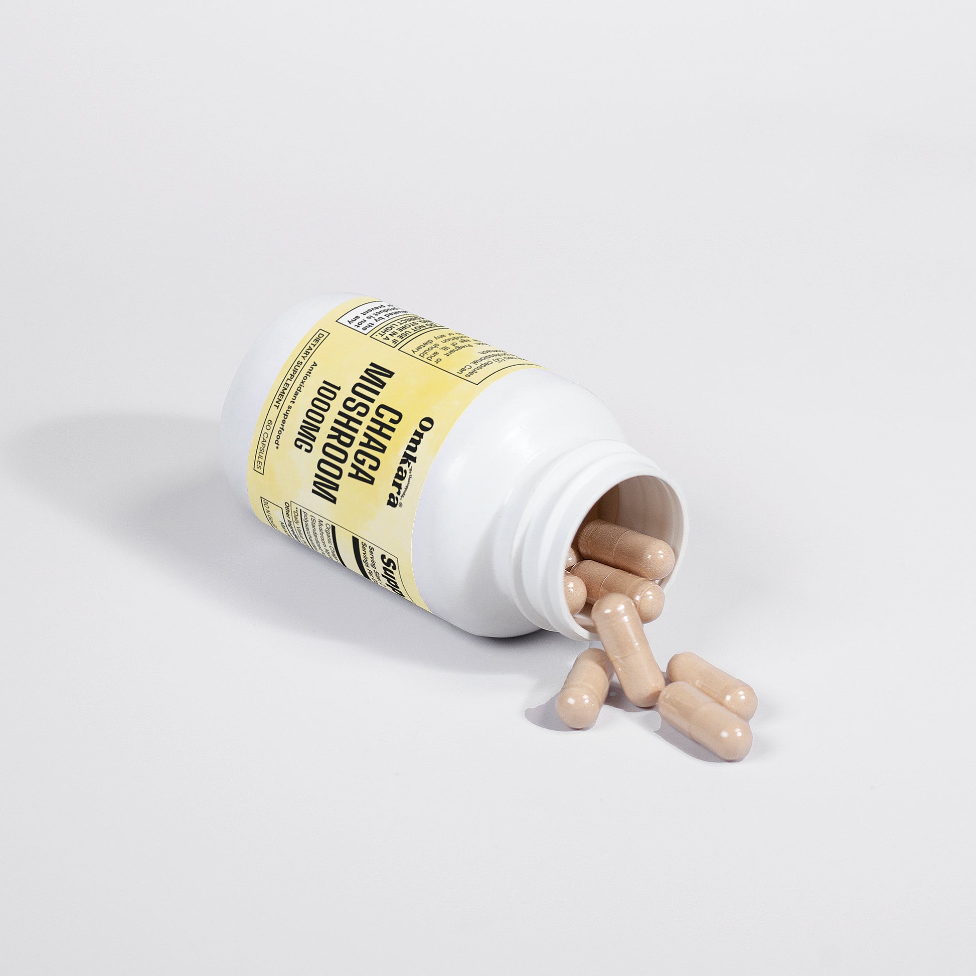 Ingredients: Organic Chaga (Inonotus obliquus) Mushroom Mycelium Powder (Standardized to 40% polysaccharides [400mg]), Organic capsule (pullulan, water), silica.